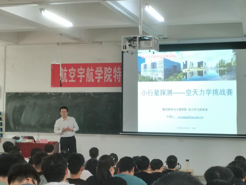 接下来,于洋教授带来《小行星探测——空天力学挑战赛》为主题的华彩报告,他从空天力学的发生发展、小行星与小行星探测任务、小行星研究中的力学问题、小行星探测任务总的力学问题四个方面给在座的同学进行了详细的讲解。于教授在讲座中提到行星研究是多学科融合的领域,他深入浅出地以讲故事的形式让在座师生了解到太阳系小行星发现、观测和探测内容,从空间力学研究的视角展开,窥一斑而知全豹,试图还原小行星研究的前世今生,报告精彩纷呈,在场各位师生们感受颇深,收获颇丰。