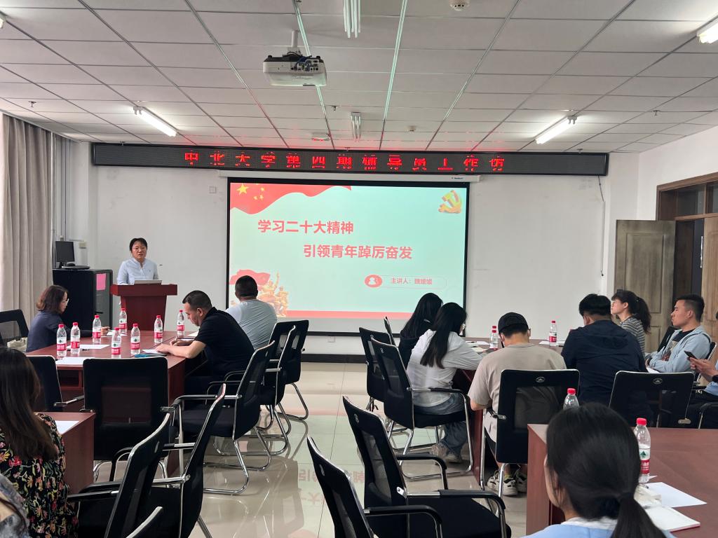 党委副书记魏媛媛以“学习二十大精神、引领青年踔厉奋发”为主题进行了理论领学。她讲到,党的二十大精神对引领青年成长成才具有重要意义,要以促进学生“听、信、行”,激发学生踔厉奋发的精神动力作为开展思想政治教育工作的价值旨归。她强调,辅导员要在学有所“思”、学有所“悟”、学有所“得”和学有所“行”五方面下功夫,筑牢思想信仰、永葆担当精神、练就过硬本领,在新时代的赛道上跑出辅导员的“加速度”。魏媛媛着重从提升学生认知力,筑牢党性思想根基;培育学生积极情绪,指引青年勇于担当;淬炼学生意志,激励青年敢于吃苦;激发学生内在动力,引导青年主动作为四方面介绍了自己的工作经验和体育赛事