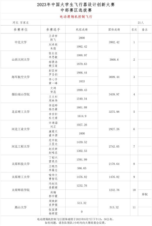 、河北科技大学、天津大学、燕山大学等在内的中部赛区28所高校、70支队伍、300多名选手。比赛选手在“电动滑翔机控制飞行”、“航天火箭发射与返回”、“多旋翼无人机任务飞行”和“机翼静载挑战”4个项目上进行了精彩角逐,不论在专业性、趣味性还是观赏性上都受到航模爱好者和现场观众的赞赏。该比赛为推动航空科技创新,普及航空科技知识,营造航空文化氛围,进一步挖掘、拓展大学生在航空航天领域的科技创新和工程实践能力打下坚实的基础。