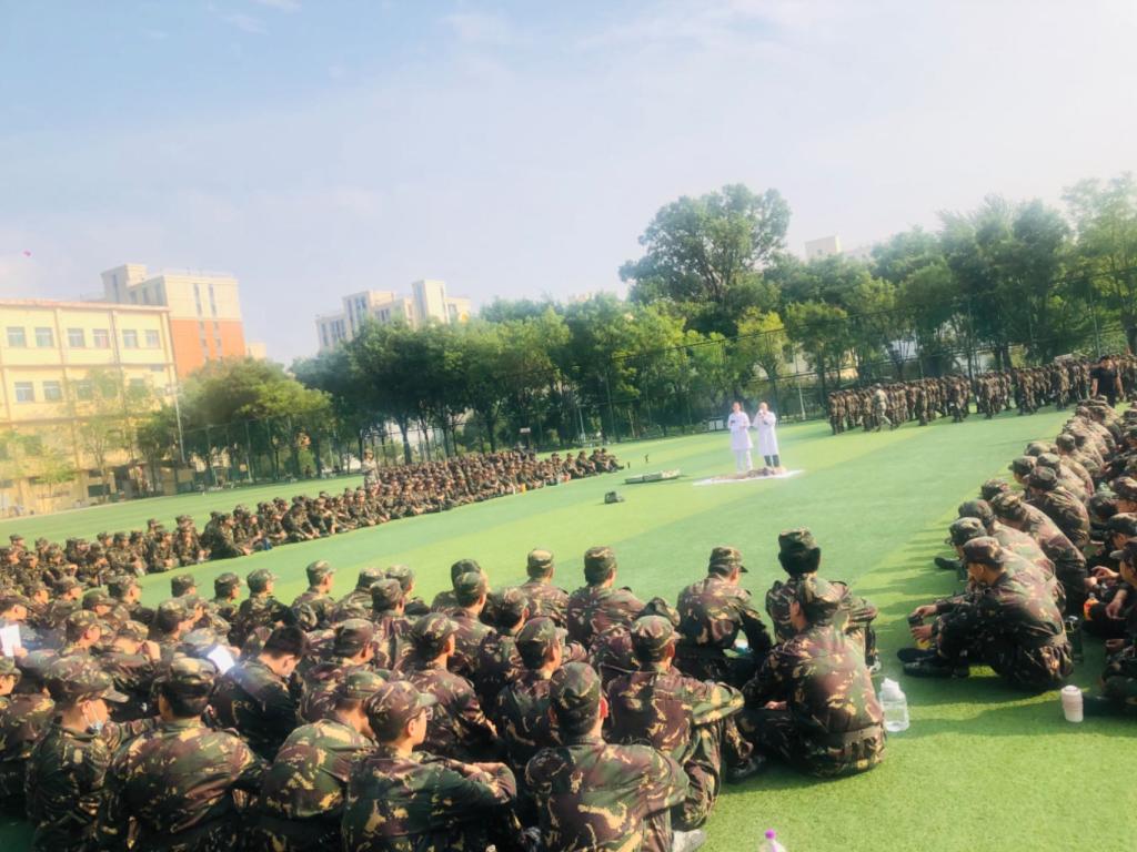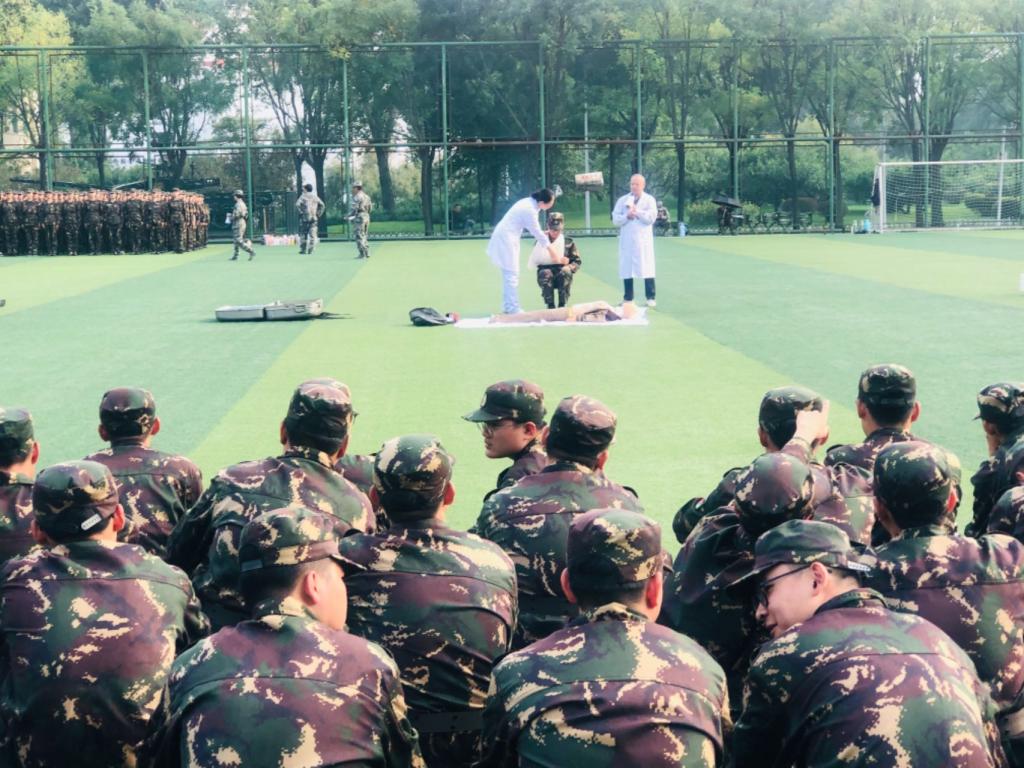 邀请校医院医生走近新生军训现场,开展应急救护培训。