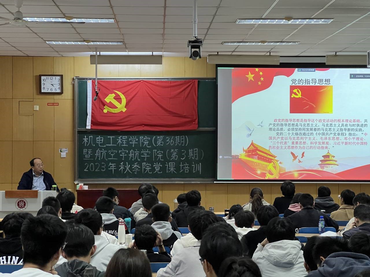 为不断加强入党积极分子的教育培养,进一步提升党员发展质量,2023年11月4日、11月5日,航空宇航体育赛事 暨机电工程体育赛事 在于11208H教室举办了2023年秋季学期入党积极分子培训班,以提高入党积极分子对党的基本理论、基本路线、基本方略的认识,增强党性修养。