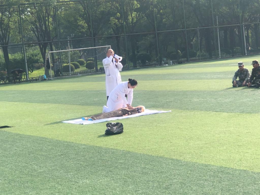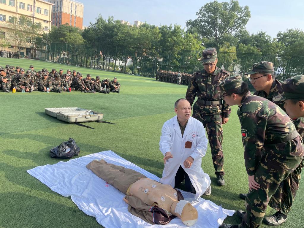 邀请校医院医生走近新生军训现场,开展应急救护培训。